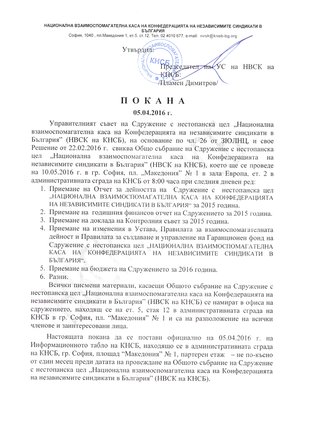 Управителният съвет на Сдружение с нестопанска цел „Национална взаимоспомагателна каса на Конфедерацията на независимите синдикати в България“ - НВСК на КНСБ, информира членовете на Сдружението, че на 22.02.2016г. на проведено заседание на УС и съгласно чл.18, ал.(1), т.3 от Устава, беше взето решение за свикване на Общо събрание на членовете на НВСК на КНСБ, на 10.05.2016г., в сградата на КНСБ, ет. 2, зала „Европа“ от 8:00 часа. За повече информация можете да прочетете приложената покана.
